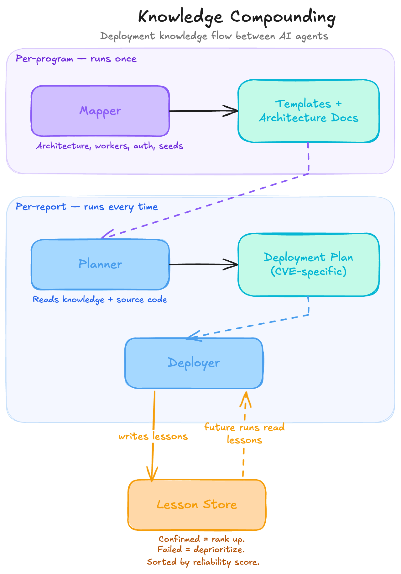 The mapper runs once per program and pre-analyzes the ecosystem: architecture, worker types, auth mechanisms, seed patterns. It produces reusable deployment templates. The planner takes a specific report, reads the mapper's knowledge alongside the source code, and outputs a CVE-specific deployment plan. The deployer merges both inputs, handles everything that doesn't match, and writes new lessons when it discovers something unexpected.