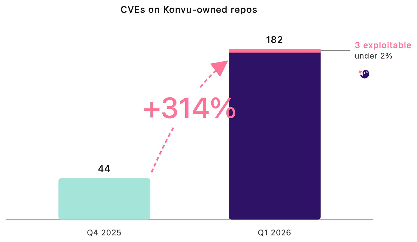 Across every Konvu repo, Dependabot opened 44 CVE alerts in Q4 2025 and 182 in Q1 2026. That is a +314% jump in a single quarter.